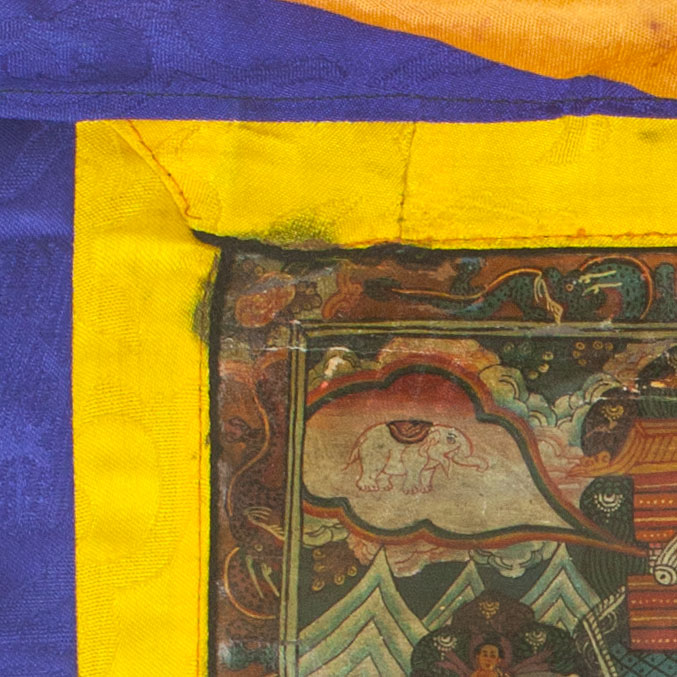 Das Thangka ist Handgemalt in Tibet und in einer traditionellen Seidenbrokatbordüre eingerahmt.