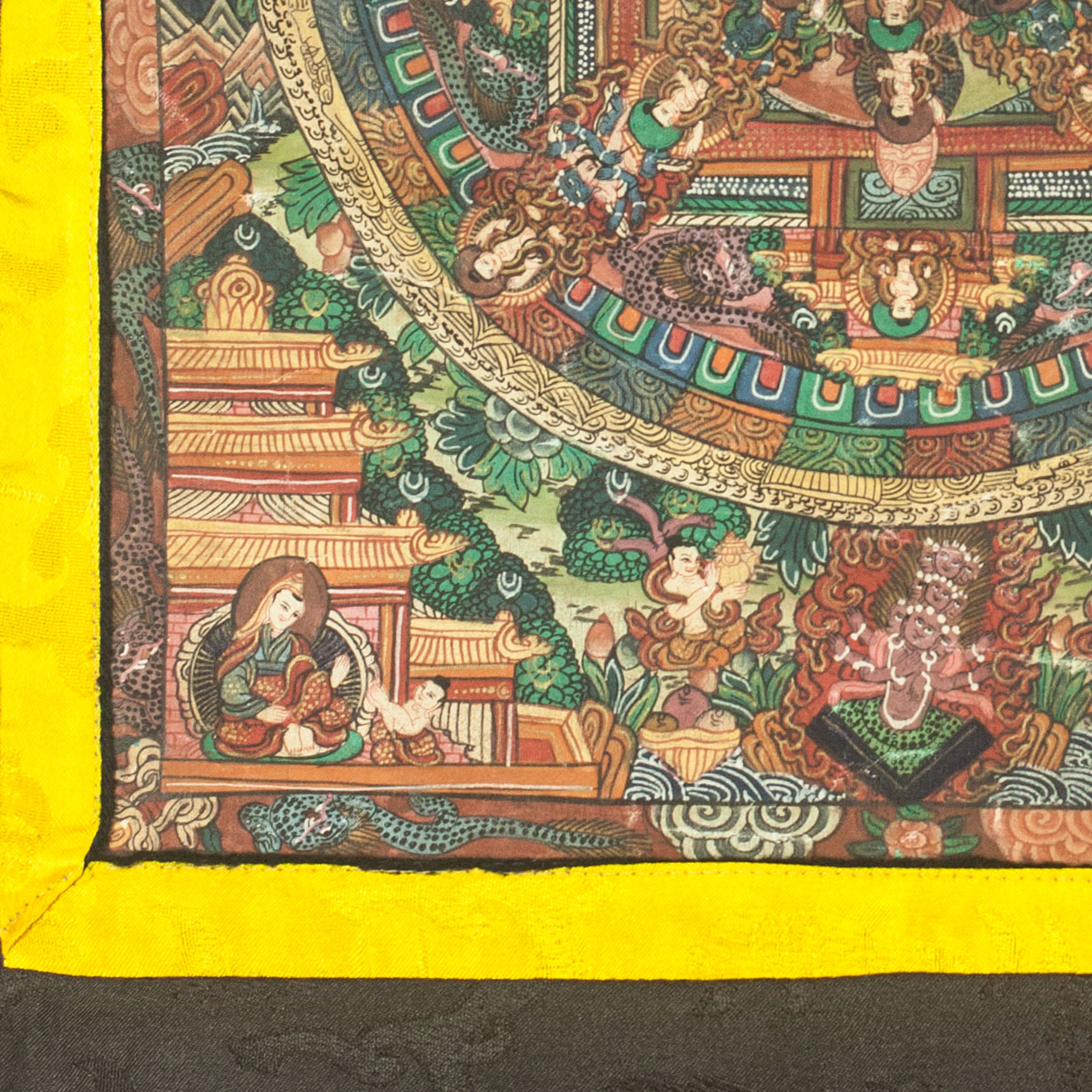 Das Thangka ist Handgemalt in Tibet und in einer traditionellen Seidenbrokatbordüre eingerahmt.