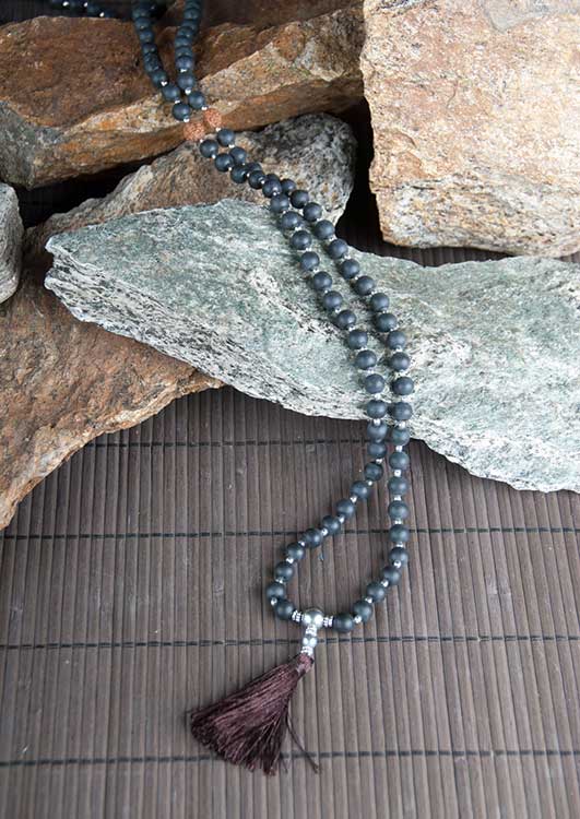 - Material: Mala mit 108 Perlen aus Obsidian und Rudraksha-Samen.