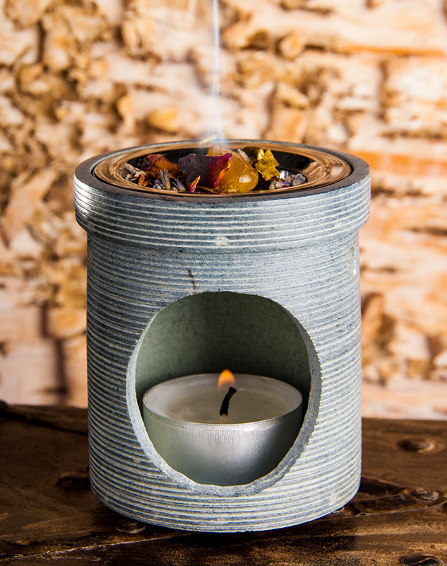 Durch die aufsteigende Hitze des Teelichts im unteren Teil des Gefäßes verglimmen die Räucherstoffe auf sanfte und langsame Weise.