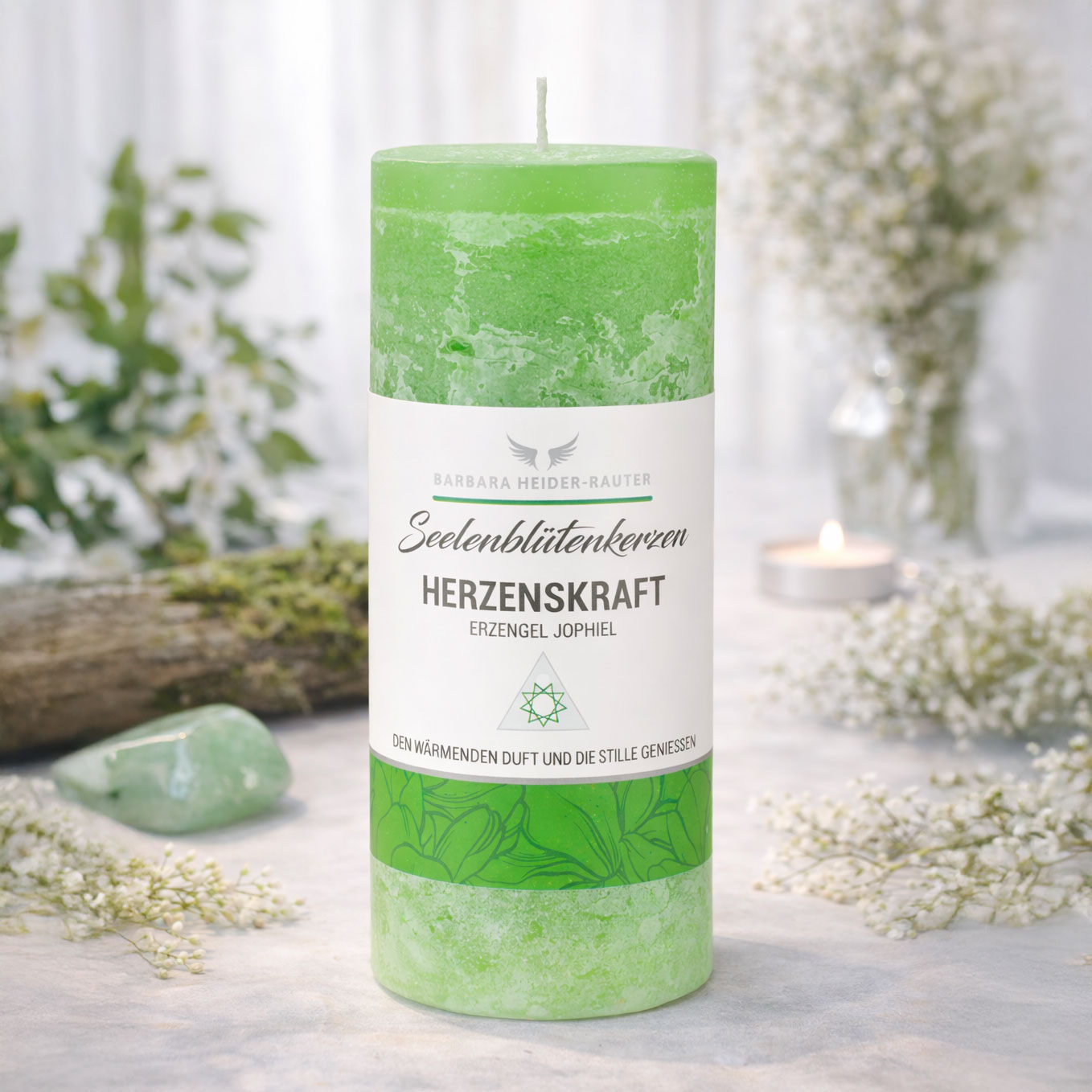 Dann ist die grüne Seelenblütenkerze Herzenskraft genau das Richtige für Dich!